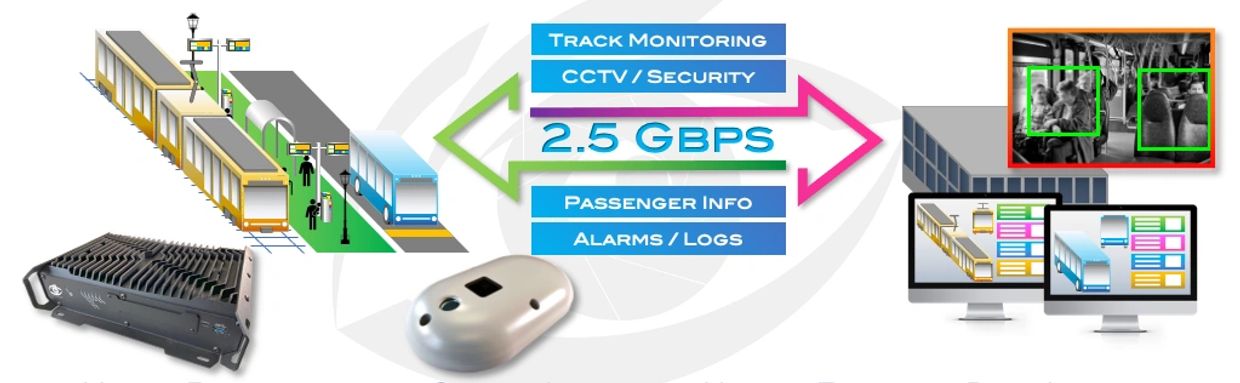 Wireless transfer this fast makes big data such as mobile CCTV or track monitoring instantly available. We use existing infrastructure and operational rules to dovetail right into the IT architecture with no impact on OT.